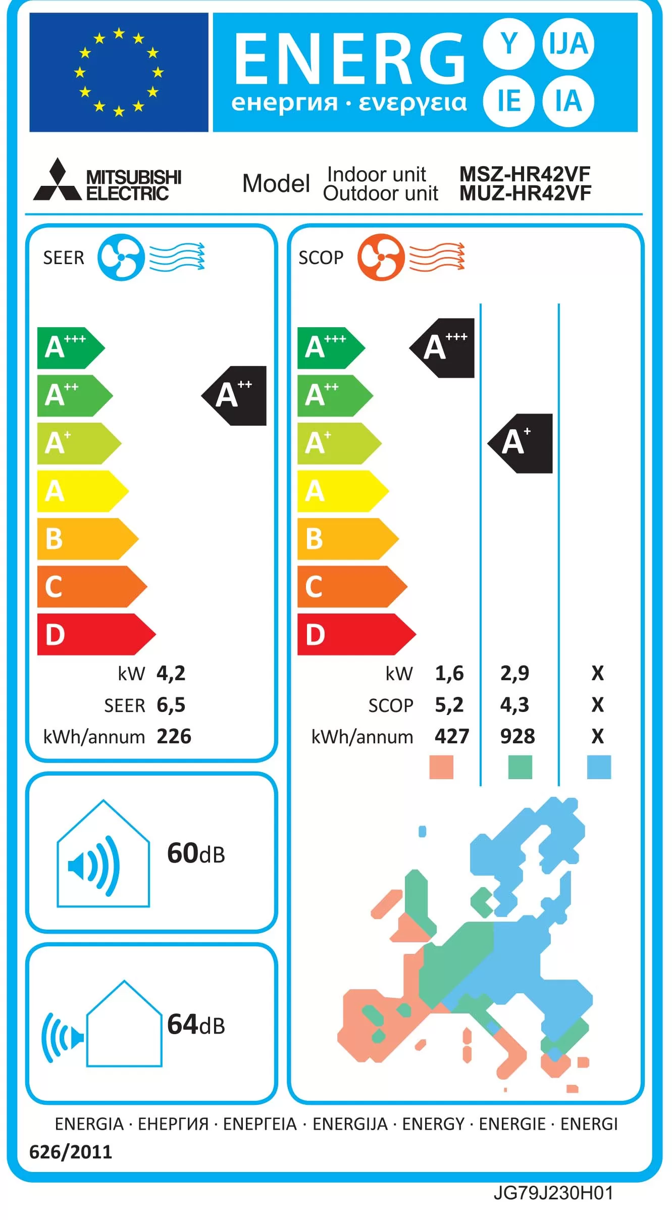 Energetska učinkovitost: Postignite značajnu uštedu na računima za energiju uz najbolju klasifikaciju SEER 6.5 (A++) i SCOP 4.3 (A+).